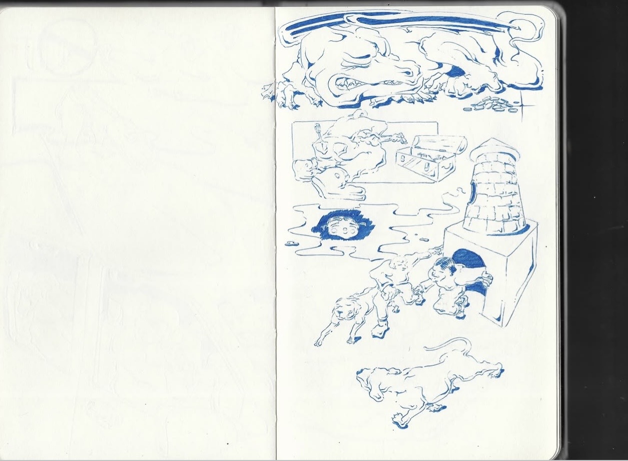 What makes Sam's work hard to pin down — in the best way — is the range. The sketchbooks are dense, detailed, obsessive in the way that only daily practice produces. Flip through one and you can feel the hours. The pen never fully lifts off the page.